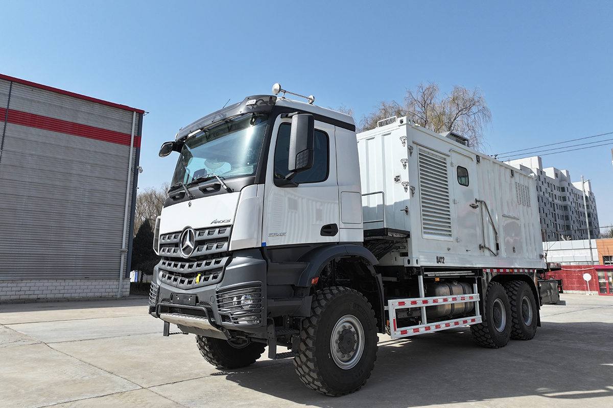 这款新型钢丝作业车采用奔驰6x6全驱动越野底盘,具备强劲动力和卓越的越野能力。除此之外,该车在国内测试车领域还具备两大亮点:首先,该车采用技术先进的双动力源驱动绞车系统,动力舱提供主要作业动力,底盘则作为装载和运输整个设备的载体,并提供备用动力。这一配置大幅延长了设备在野外作业中的使用寿命,并为用户提供了充分的安全保障。其次,液压系统采用闭式液压回路设计,控制绞车油泵、马达采用双手柄液控形式,结构简单,质量可靠,操作轻便灵活,这一设计显著提升了操作的便捷性和可靠性。这些技术创新使得该钢丝作业车非常适用于钢丝震击、投捞、试井等作业,充分满足了用户的多样化需求。